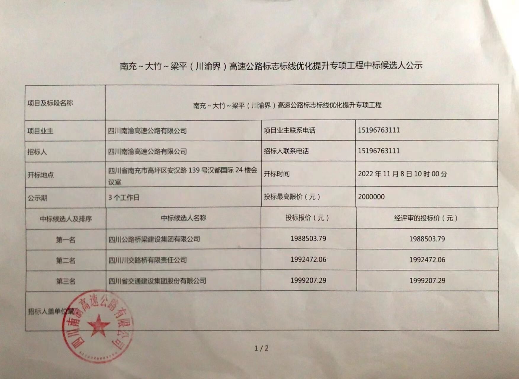 南充~大竹~梁平(川渝界)高速公路标志标线优化提升专项工程中标候选人公示