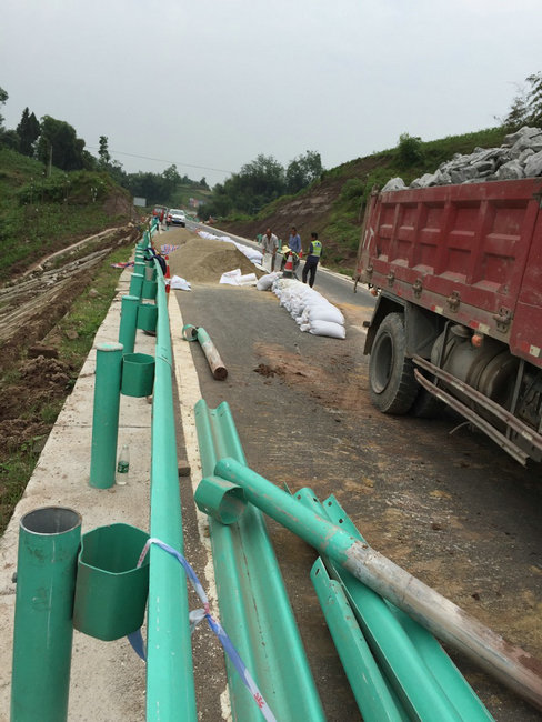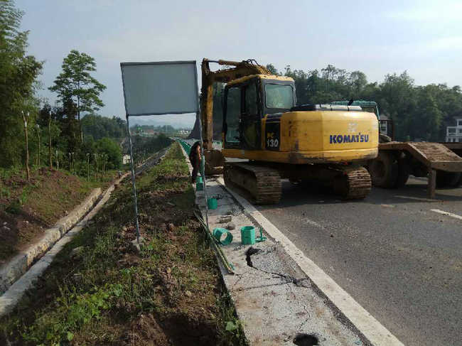 初步制定处置方案:1、封闭开裂裂缝,防止雨水进一步渗透,对左幅路基进行加宽,采取片石回填(回填深度1.5-2米)后上覆盖20厘米C25混凝土路面以解决临时安全通行问题;2、对路基外原河沟进行改道(图中红线标识位置);3、原河沟凹陷位置全部回填并复耕还地(图上黑线区域);4、滑坡段路基坡脚设置反压护道,原路基逐层碾压路面恢复原状。预计施工工期30天。截止2017年5月10日上午,正开展应急抢修。提醒广大司乘人员服从现场交警指挥,谨慎驾驶,注意避让,缓慢通行,保障安全。