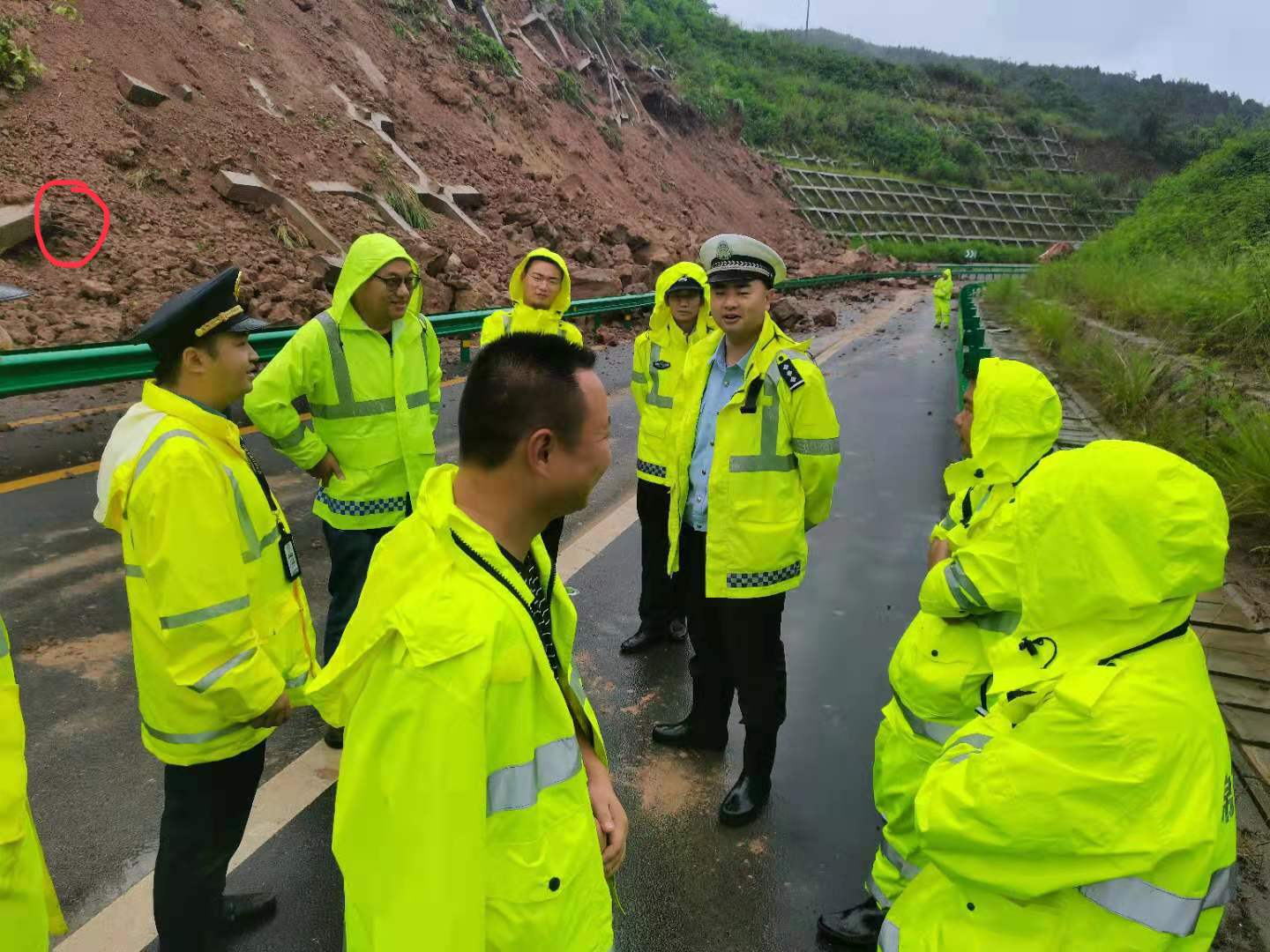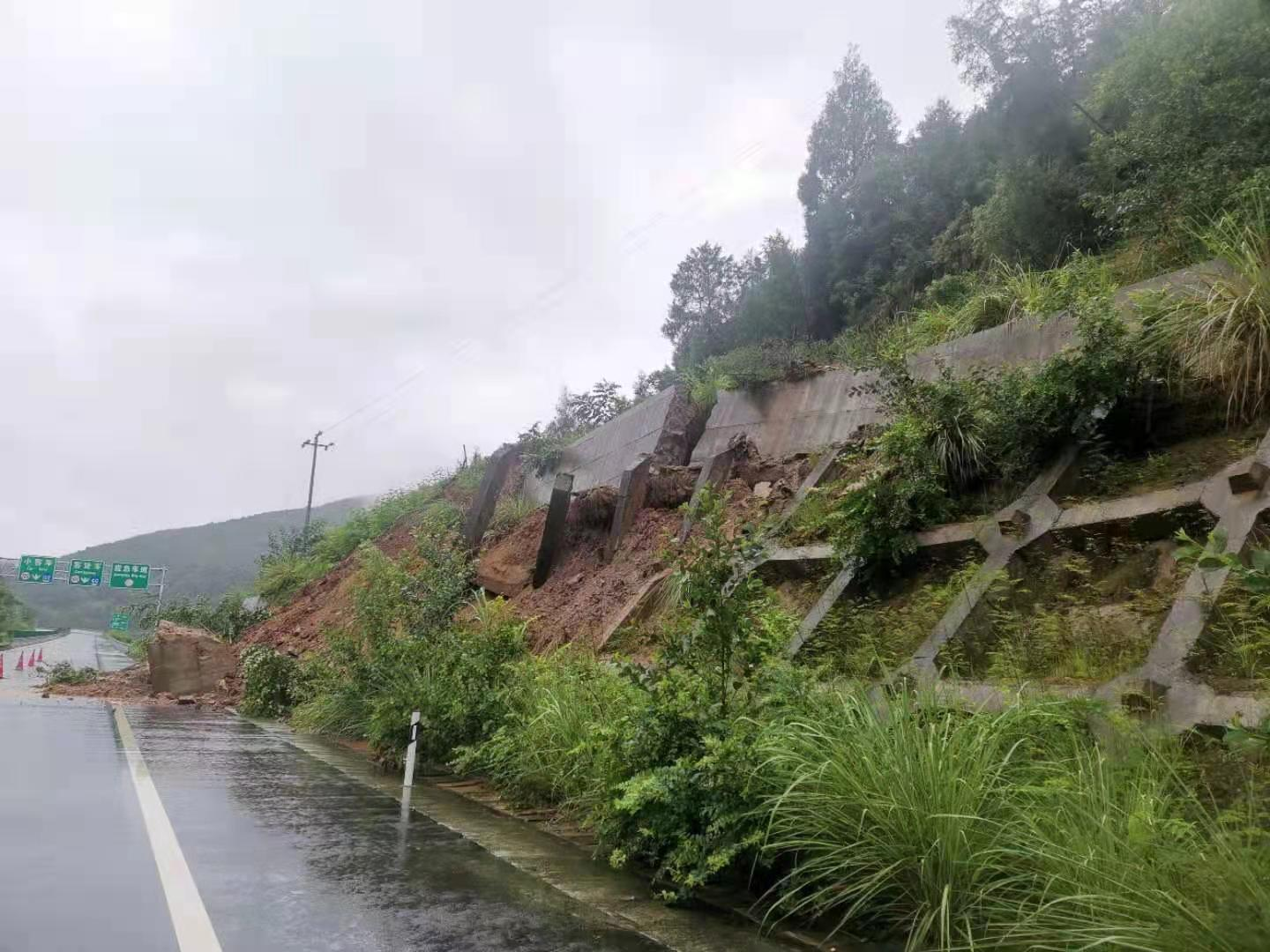 8时50分柏梓互通盐亭至柏梓方向匝道边坡滑坡,造成盐亭至柏梓方向匝道和柏梓至绵阳方向匝道交通阻断。险情发生后,工程养护处人员第一时间赶至现场。由于现场持续暴雨,边坡不稳定,存在二次滑坡的风险,加上坡顶还有一根高压电线杆已经倾斜。根据高管局“七不抢”的原则,工程养护处会同高速交警、高速执法现场商议决定:暂时封闭西充至柏梓及柏梓至绵阳匝道,养护公司做好封闭匝道的管制措施,待边坡稳定后再进行处理。